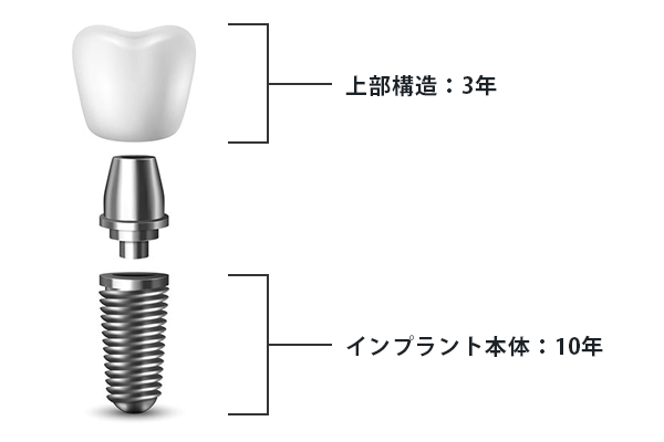 インプラント本体は治療終了後10年間、かぶせ物(上部構造)は3年間です(磁性アタッチメント・ロケーターは3年間)。